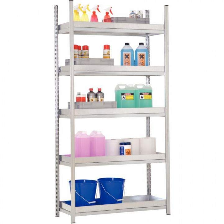 Rayonnage de départ 102X40X200cm. Pour le stockage de bidons d’huile, graisse et produits dangereux. Bacs avec rebords non blessants. 5 niveaux de rétention en tôle galvanisée. Niveaux réglables au pas de 40 mm.