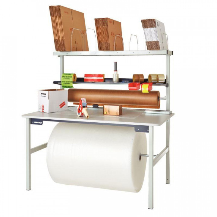 Poste d'emballage ERGOPACK. Le poste d’emballage Ergopack est une table de travail ergonomique, optimisée pour les opérations de conditionnement en atelier ou en entrepôt. Dimensions du plateau : 1600x800mm. Conçu dans le respect des règles de sécurité des opérateurs les plus strictes, ce poste de travail a été étudié dans le moindre détail : règle de coupe sécurisée, hauteur du plateau à 860 mm du sol, hauteur de préhension des composants, angles de plateaux arrondis non blessants...