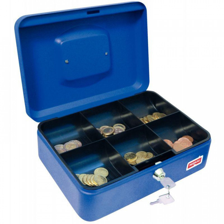 Caisse à monnaie 20x16x9cm. En acier finition époxy, casier plastique 5 compartiments, serrure à pêne, poignée métal chromé, livrée avec 2 clés. Coloris bleu.
