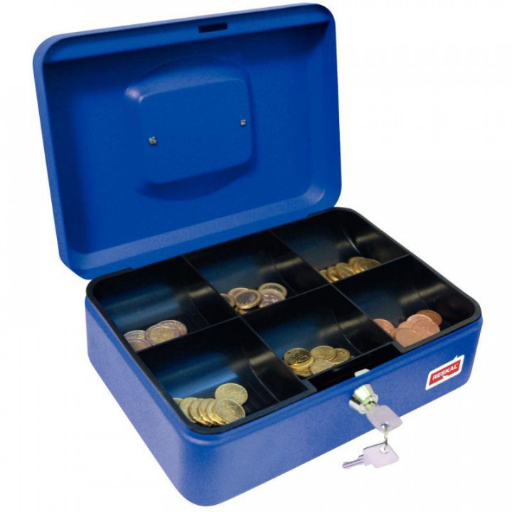 Caisse à monnaie 25x18x9cm. En acier finition époxy, casier plastique 5 compartiments, serrure à pêne, livrée avec 2 clés. Coloris selon arrivage.