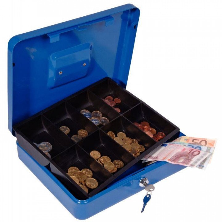 Caisse à monnaie 30x24x9cm. En acier finition Epoxy. A l'intérieur casier à monnaie plastique noir amovible, 5 compartiments. Poignée métal chromé, serrure à clé, livrée avec 2 clés. H 9cm, l 24cm, P 30cm « Coloris non déterminé. Suivant la source d'approvisionnement »
