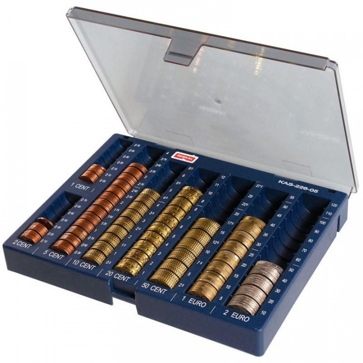 Monnayeur avec couvercle. En polypropylène antichocDe faible encombrement, s'adapte à tous les tiroirs Capacité d'encaisse totale : 226.05 eurosLe couvercle bleu fumé transparent est amovibleLes colonnes sont graduées et indique directement le montant des espèces dans le monnayeur.Equipé de 2 pieds retractablesDimensions : 35/70x235x185mm