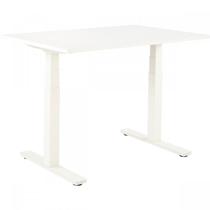 Bureau assis debout L120 cm Boost plateau blanc/ piètement blanc. Plateau en mélaminé épaisseur 25 mm. Chants antichoc 2mm. Livré avec boitier de commande. Vitesse de progression maximum 40 mm/s. Hauteur réglable de 65 à 130 cm. Silencieux (<45dB). 3 positions mémorisables. Prise USB et USB-C. Piètement carré et barre stabilisante centrale. Charge maximale 120 kg. Garantie 5 ans.
