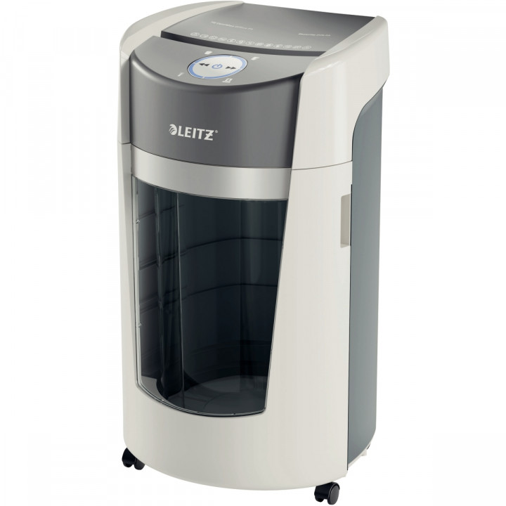 Destructeur IQ Optimax Office. Unique sur le marché avec technologie de corbeille rotative et amovible. Nouveau design et nouvelle interface utilisateur avec cadran lumineux. Niveau de sécurité P5 2 x 15mm. Détruit en une seule fois 10 feuilles A4 80g/m2. Corbeille à papier cylindrique et éclairée, équipée d'une large fenêtre de visualisation, d'une capacité de 35 litres acceptant jusqu'à 550 feuilles. Moteur performant et ultra silencieux. Temps de fonctionnement de 2 heures en continu. Accepte agrafes et trombones. Dimensions (H x L x P cm) : 58,9 x 40,6 x 32. Garantie de 2 + 1 ans* (en s'enregistrant sur le site Leitz).