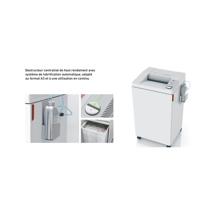 Destructeur 3104 coupe fibres 4mm 26 feuilles. Adapté au format A3 et capacité de 120 litres ! Détruisez également des feuilles A4 dans le sens de la longueur pour plus de rapidité grâce à la large ouverture de 310mm. Système de Protection et de Sécurité "SPS". Commande électronique multi-fonctions EASY-SWITCH. Electronique de Contrôle de Capacité "ECC": voyants signalant le rendement du destructeur afin d'éviter les bourrages. Marche / arrêt automatiques par cellule. Réceptacle pratique de 120 litres avec poignée de préhension. Meuble en bois avec porte, monté sur roulettes. La fonction économie d'énergie occasionne un mode "zéro énergie": le destructeur s'arrête complétement et ne consomme plus aucune énergie au bout de 15 mn. Garantie à vie sur cylindres de coupe de 5 ans sur autres pièces