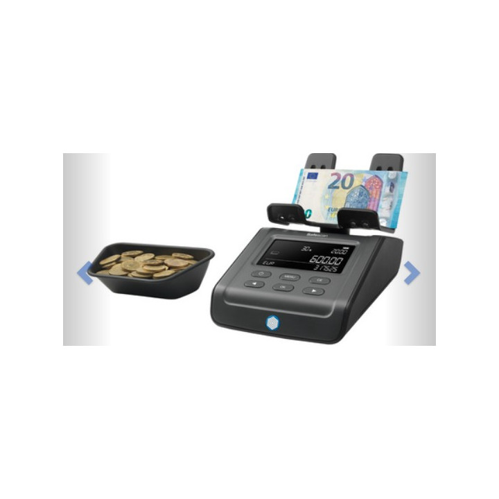 compte les pièces, billets de banque, rouleaux de pièces, liasses de billets, algorithme de compte adaptif, 13 devises préinstallées: EUR/CHF/USD/GBP/PLN/HUF/SEK/NOK/DKK/BGN/CZK/ RON/TRY/HRK/RSD, avec plateforme, gobelet à pièces, (131-0700) adaptateur secteur et câble USB, fiche euro