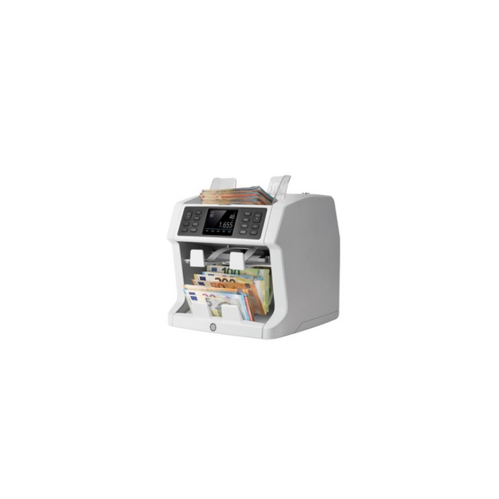 détection de faux billets en 7 points pour toutes devises:UV encre magnétique, fil métallique, infrarouge, image, épaisseur & taille, trie les billets de toutes les devises et des devises mélangées EUR/CHF/GBP/USD, deux compartiments (112-0649) dimensions: (L)215 x (P)271 x (H)264 mm, fiche de courant avec terre - pour CH adaptateur fixe inclus
