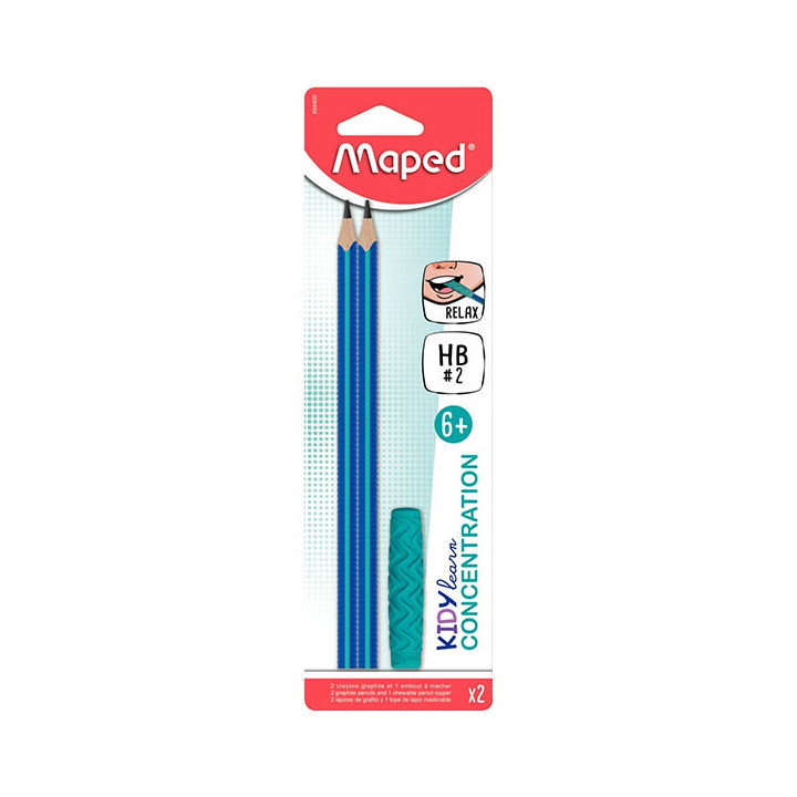 Blister de 2 crayons embout relax. Blister de 2 crayons graphite triangulaire HB. Aide les enfants recherchant une stimulation pour soulager le stress ou améliorer la concentration. Silicone alimentaire 100% non toxique. Bout à mâcher. Graphite texturé pour une meilleure prise en main Mine HB, facile à tailler.