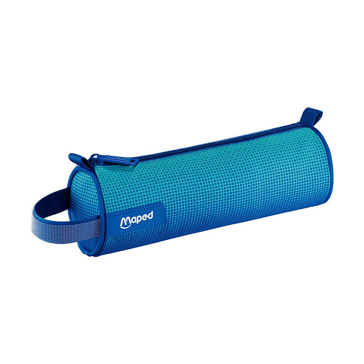 Blister trousse ronde KIDY LEARN. Tissu et doublure en polyester de haute qualité. Tirette pour une ouverture facile, fermeture glissière très résistante. Longueur : 22.5cm, diamètre : 7.5cm