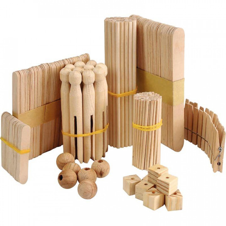 Méga pack de construction en bois, 450 pièces. 450 pièces en bois pour travaux manuels : 15 grosses pinces à linge à tête ronde (11 x 2 cm), 12 pinces à linge (4,8 x 2 cm), 80 mini languettes (6,5 x 1 cm), 80 moyennes languettes (11,4 x 1 cm), 80 grandes languettes (14,8 x 2 cm), 80 grands bâtonnets (14,8 x 0,5 cm), 80 petits bâtonnets (7,8 x 0,3 cm), 13 perles rondes (Ø.2 cm) et 10 perles carrées (1,4 cm).