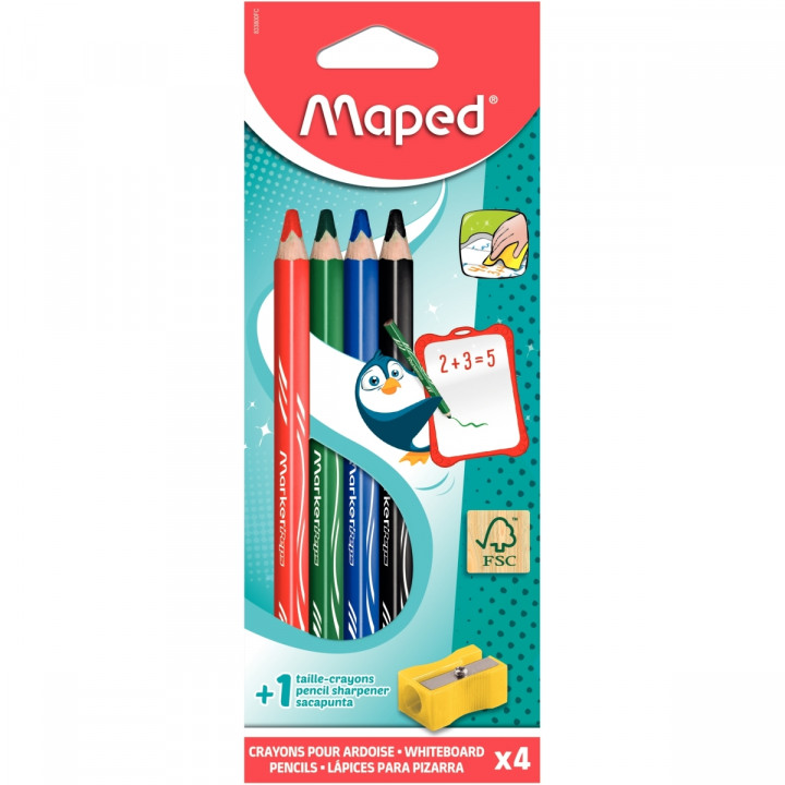 Etui de 4 crayons effaçable Markerpeps assortis + 1 taille crayon. Mine grasse de 5,8 mm. Corps triangulaire pour une meilleure prise en main. Ne sèche pas. Effaçable à sec sur une ardoise blanche standard. Crayon durable bois certifié FSC. Coloris bleu, noir, rouge, vert et 1 taille-crayon. Longueur : 153mm.