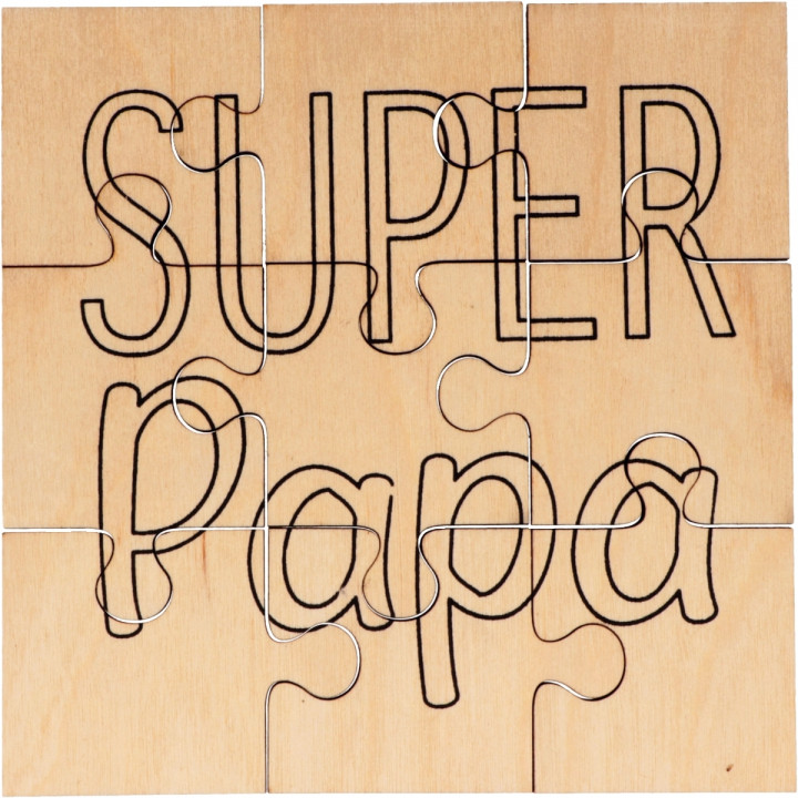 Puzzle en bois 9 pièces, Super Papa. Puzzle en bois naturel pré dessiné. A décorer et à offrir pour la fête des pères. Dimensions : L.14 x l.14 x ép.0,4 cm.