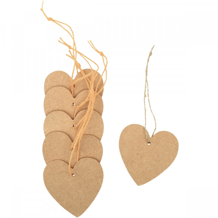 Lot de 6 cœurs en bois MDF à suspendre. Cœurs percés avec une cordelette intégrée. Bois MDF lisse, à personnaliser et à accrocher sur une poignée de porte, une fenêtre, un porte-clés... A décorer brut avec un pyrograveur, à peindre ou à recouvrir de Décopatch, de paillettes... les possibilités de créations sont infinies ! Dimensions du cœur : L.8 x l.8 x ép.0,3 cm.