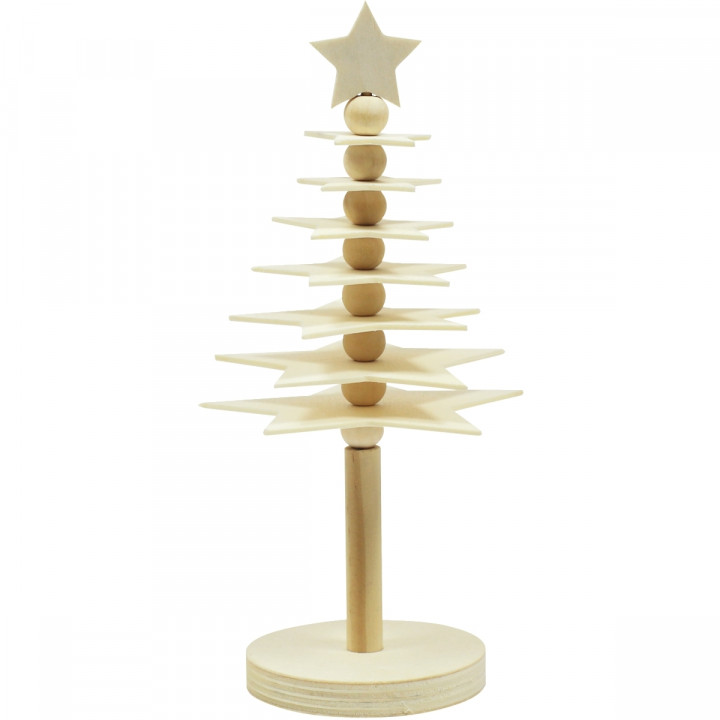 Lot de 10 sapins étoiles à monter en bois. En bois naturel. Sapin à assembler soi-même et à décorer. Chaque sapin se compose d’un socle (Ø.6,5 cm), d’un mat en 2 parties (H. totale 16 cm), de 8 étoiles (Ø. de 3 à 9 cm) et de 8 perles (Ø.1,2 cm). Sapin créatif, moderne et original.
