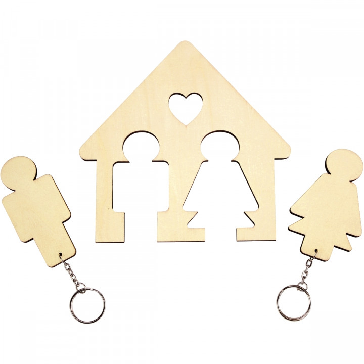 Range-clés maison en bois à suspendre. En bois brut à décorer et à suspendre. Range clés original en forme de maison avec une découpe cœurs et 2 porte-clés amovibles en forme de personnages. Cadeau idéal pour la fête des mères et des pères. Avec une attache au dos pour l'accrocher. Dimensions de la maison : L.15 x H.15 x ép.0,5 cm. Dimensions d’un porte-clés : L.4,5 x H.9 cm.