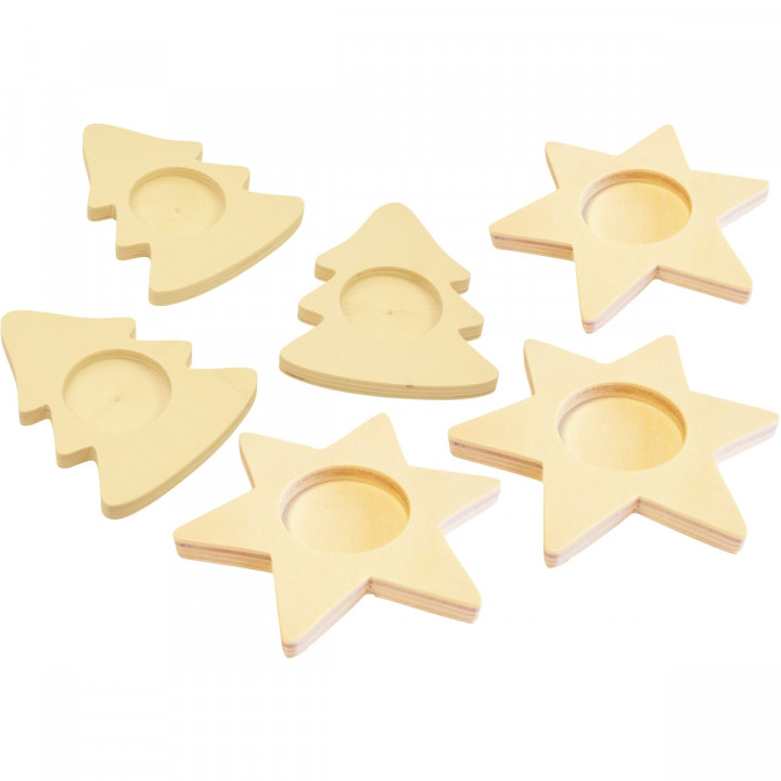 Lot de 6 bougeoirs sapins + étoiles assortis. En bois brut. Porte-bougie chauffe-plat épais idéal pour décorer les tables de Noël. A personnaliser avec de la peinture, des paillettes, des strass… Livré sans bougie. Dimensions du sapin : L. 9 x H. 12 cm. Diamètre de l'étoile : 12 cm. Épaisseur du bois : 1 cm.