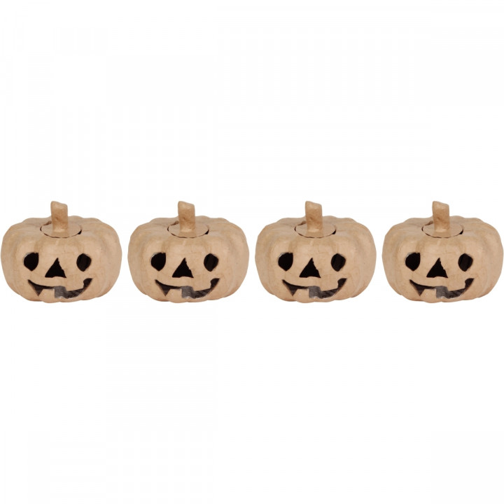 Lot de 4 citrouilles en carton brun. Citrouilles d'Halloween en carton épais, à décorer et à poser sur le bord des fenêtres ! Avec une ouverture chapeau sur le dessus pour y glisser une bougie à LED (code 39494). Diamètre et hauteur : 11 cm.