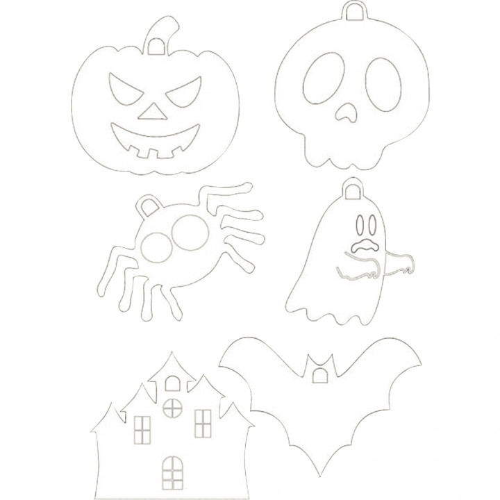 Lot de 36 suspensions Halloween en carton blanc. Atelier créatif pour décorer la classe pendant la fête d’Halloween ! Pack collectif. Contenu : 6 planches en carton blanc avec 6 formes pré découpées et pré dessinées (citrouille, crâne, araignée, fantôme, maison hantée et chauve-souris). A décorer et à suspendre. Suspensions pré percées, livrées sans fil. Hauteur : 7 à 10 cm.