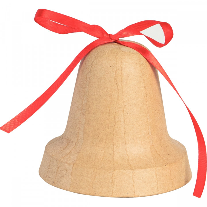 Cloche à suspendre avec ruban et grelot. Cloche en carton brun très épais équipée d'un véritable grelot et d'un élégant ruban rouge noué. A décorer pour les fêtes de Pâques et à suspendre. Livrée avec une cordelette. Dimensions : Ø.10 x H.9 cm.