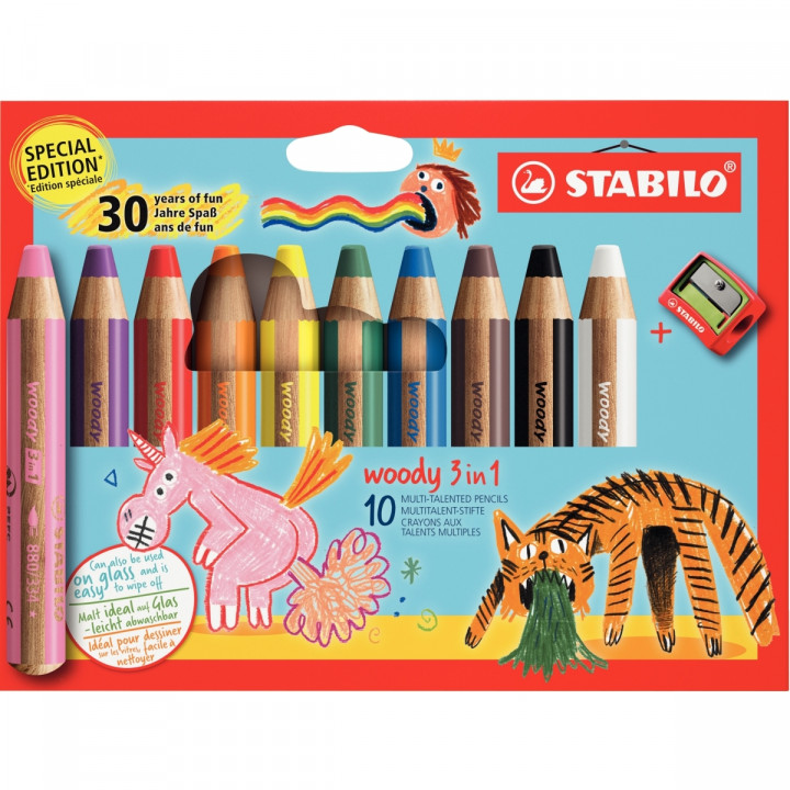 Etui de 10 crayons Woody 30 ans + 1 taille-crayon. Crayon 3 en 1 à la fois crayon de couleur, craie grasse et aquarelle. Son corps large et léger est parfaitement adapté aux petites mains. Sa mine grasse extra tendre et très pigmentée permet de dessiner et écrire sur une multitude de surfaces, telles que le bois, le verre, le plastique, le carton ou encore une ardoise, un tableau noir ou blanc. Sa mine aquarellable se dilue avec un pinceau et de l’eau. Longueur 11cm, diamètre mine 10cm, diamètre crayon 15 mm. Corps rond.