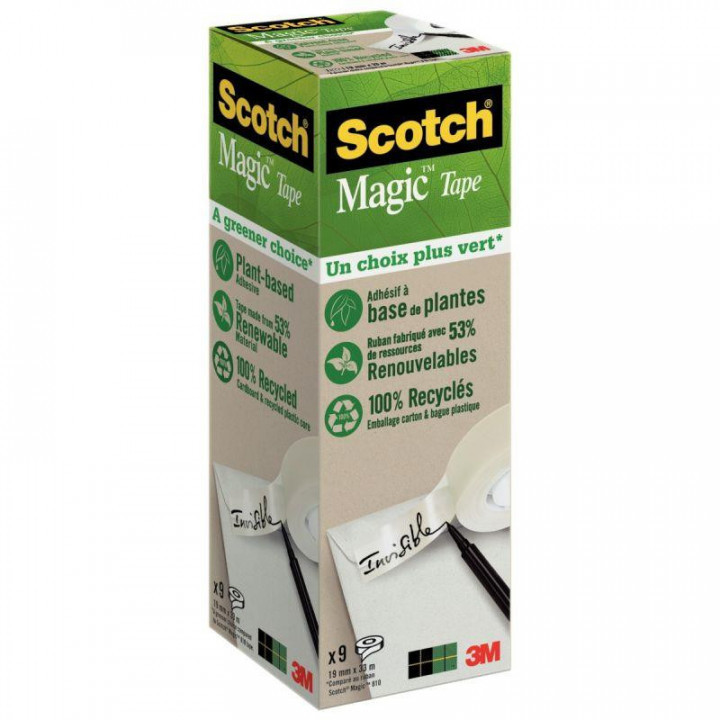 Pack de 9 rouleaux adhésifs Magic Green 19mmx33m. Ruban complètement invisible après application, il le restera au fil du temps. C'est l'outil idéal pour les finitions soignées ou les travaux professionnels : réparer, sans laisser de traces, des documents déchirés, assembler des feuilles de papier, afficher des notes ou des pense bêtes, faire des montages à photocopier...Ne se déchire pas au déroulement, se déroule en douceur et sans bruit, parfaitement invisible une fois collé, indétectable à la photocopie. Permet l'écriture, ne jaunit pas.
