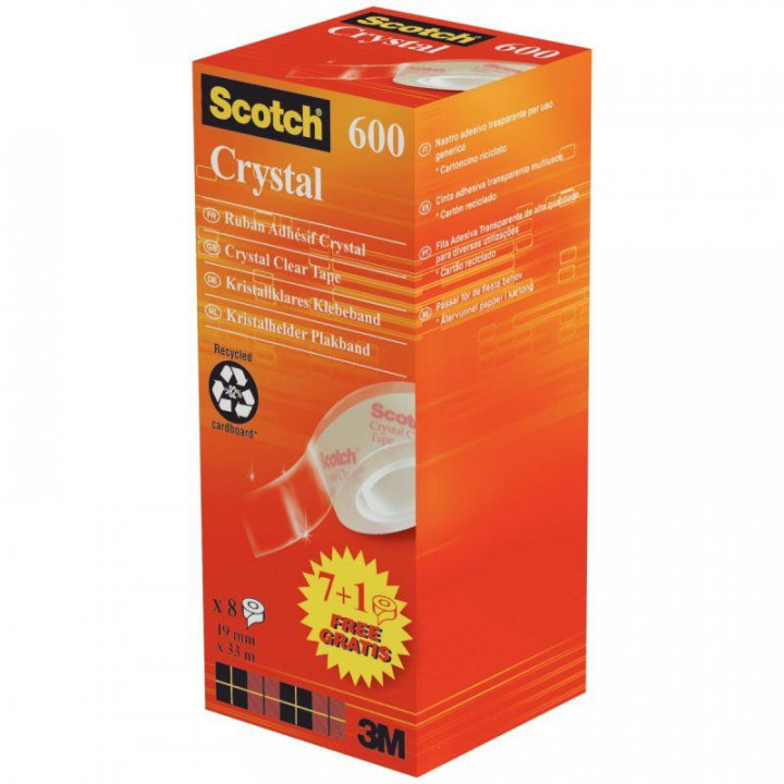 Tour de 8 rouleaux adhésifs transparents Cristal 19mmx33m. Le ruban adhésif Scotch Crystal se reconnaît par sa transparence. Multi usages, il permet des finitions soignées comme la protection d'une étiquette ou le renforcement de documents de type scolaires. Il ne jaunit pas en vieillissant. Finition brillante.