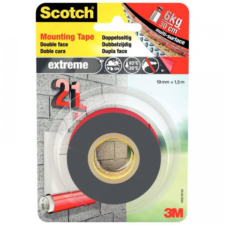 Rouleau adhésif Scotch fixation double face extra fort 19mmx1,5m. Mousse adhésive de fixation double face pour usage intérieur et extérieur. Permanent et durable, tient jusqu'à 10 kilos.