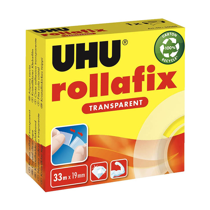 Rouleau adhésif transparent Uhu 19mmx33m. Ruban adhésif transparent de qualité supérieure. Colle fortement et ne jaunit pas. Les rubans transparents se découpent à la main.
