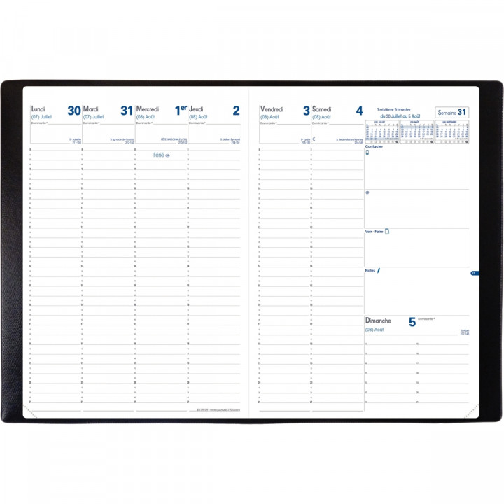 Agenda semainier EU 09/09 noir. Format 21 x 29.7 cm. 13 mois août à août . La semaine à la verticale sur 2 pages avec rendez vous par 1 / 4 d'heure. 10 Pages d'informations économiques et pratiques. Atlas couleur. Livré avec répertoire amovible. Couverture amovible noire en plastique. Papier blanc. Reliure cousue. Coins détachables.