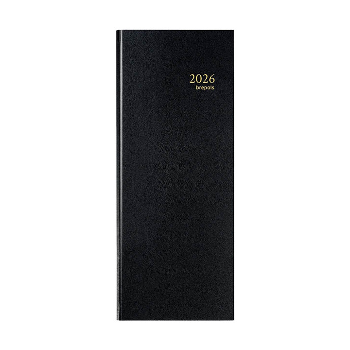 Agenda banquier long 2 volumes noir. Format : 14.3 x 32.5 cm. 1 jour par 2 pages. Réglure euros et cents. Pages indexées avec pavé mensuel. Couverture en similicuir. Volume 2 : 2 x 384 pages.