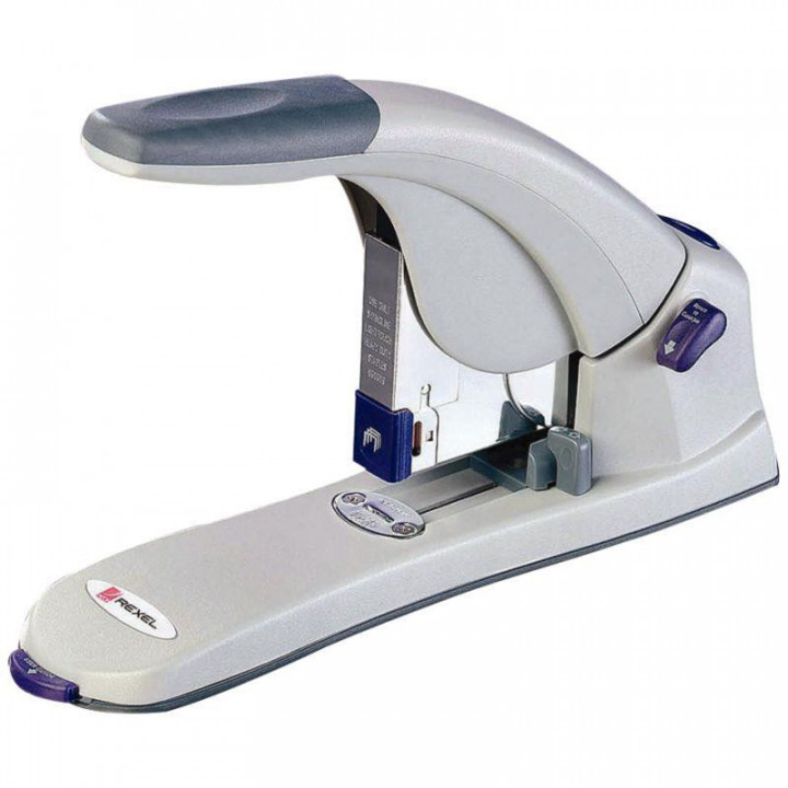 Agrafeuse brocheuse Mercury 120 feuilles. Contenance 150 agrafes Mercury. Corps en acier et poignée avec un grip caoutchouc. Mécanisme muni d'un bouton anti-enrayage et d'un taquet de réglage de profondeur d'agrafage. Chargement frontal par bouton poussoir. Livrée avec une boîte de 400 agrafes. Longueur 320mm. Poids: 1,4kg. Garantie 5 ans.