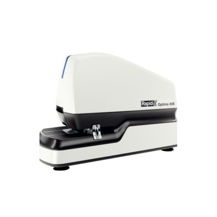 Agrafeuse électrique Rapid Optima 60E 60 feuilles. Automatique sans contact: détecte l'insertion du papier et adapte automatiquement la puissance d'agrafage. Lignes de repères imprimées sur l'agrafeuse pour faciliter le placement du papier. Indicateur LED de niveau d'agrafes. Alimentation secteur et boîte de 5000 agrafes Optima HD70 fournies. Dim: L234xH165xP91mm. Garantie 5 ans.