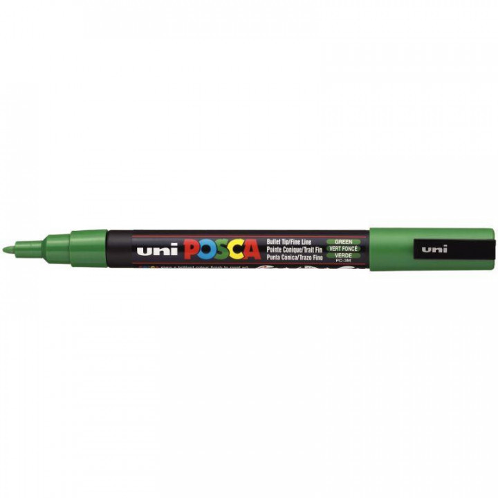Marqueur Posca pointe fine ogive vert foncé. Les couleurs sont denses, opaques, couvrantes, superposables et ne pâlissent pas à la lumière. L'encre est inodore. S'applique sur tous supports : papier, bois, plastique, verre, métal… Peint, dessine, écrit et marque. Pour des applications illimitées !