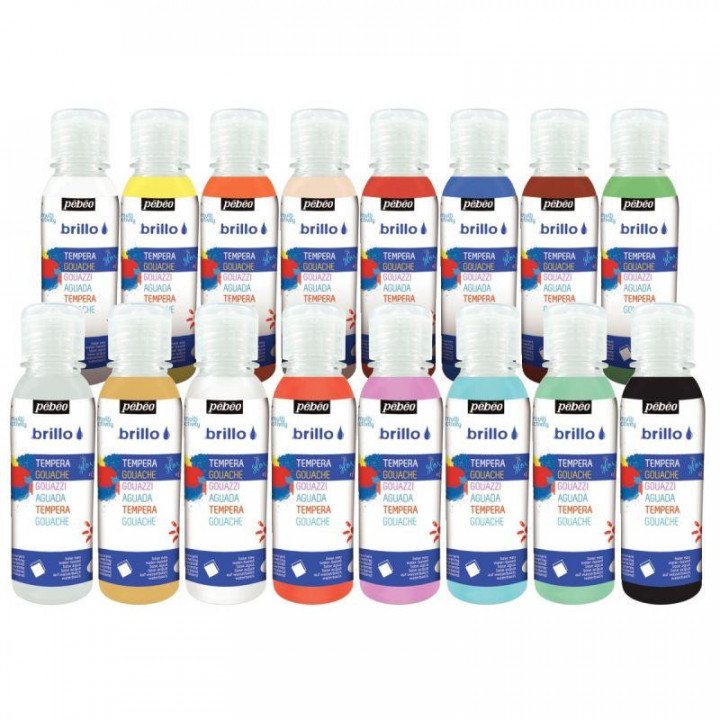 Carton de 16 Flacons de 150 ml de gouache brillante BRILLO couleurs assorties. Couleurs assorties : blanc, jaune primaire, jaune doré, rose clair, rouge primaire, bleu primaire, vert clair, marron, noir, or, argent, blanc nacré, rouge nacré, rose nacré, turquoise nacré et vert nacré. Gouache liquide prête à l'emploi, opaque et onctueuse, elle assure une brillance exceptionnelle après séchage (effet laqué). Les couleurs sont miscibles entre elles. Dilution déconseillée, car l'adjonction d'eau entraîne une perte de brillance. S'applique au pinceau, à la brosse ou au rouleau, sur papier, carton, bois, rhodoïd, pâte à sel... Nettoyage du matériel, de la peau et des vêtements à l'eau savonneuse. Dès 5 ans.