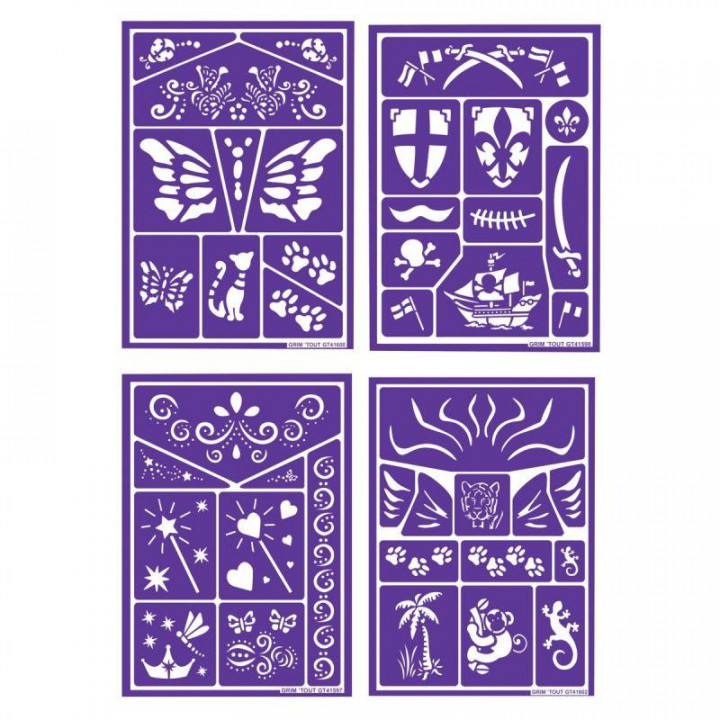 Lot de 4 planches de pochoirs de maquillage assorties. 4 thèmes : chats et papillons, pirates, contes de fées et jungle. Chaque planche comporte de 4 à 7 pochoirs, selon la taille des motifs. Lavables, adhésifs, repositionnables et souples pour s'adapter à la forme du visage, de la main...