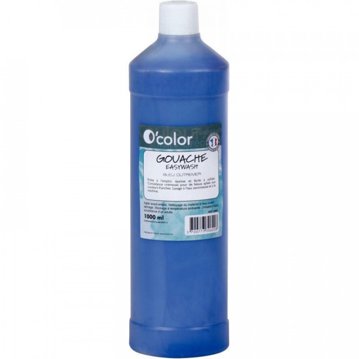 Flacon 1 L de gouache liquide économique O'COLOR coloris bleu foncé. Gouache EASYWASH lavable à l'eau savonneuse et à la machine. Prête à l'emploi, épaisse et facile à utiliser. Consistance crémeuse pour de beaux aplats aux couleurs franches. Agiter avant emploi. Nettoyage du matériel à l'eau avant séchage. Stockage à température ambiante.