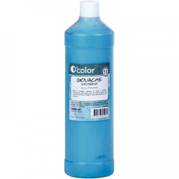 Flacon 1 L de gouache liquide économique O'COLOR coloris cyan. Gouache EASYWASH lavable à l'eau savonneuse et à la machine. Prête à l'emploi, épaisse et facile à utiliser. Consistance crémeuse pour de beaux aplats aux couleurs franches. Agiter avant emploi. Nettoyage du matériel à l'eau avant séchage. Stockage à température ambiante.
