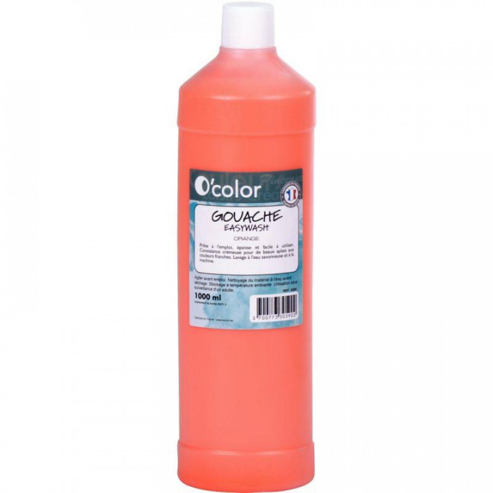 Flacon 1 L de gouache liquide économique O'COLOR coloris orange. Gouache EASYWASH lavable à l'eau savonneuse et à la machine. Prête à l'emploi, épaisse et facile à utiliser. Consistance crémeuse pour de beaux aplats aux couleurs franches. Agiter avant emploi. Nettoyage du matériel à l'eau avant séchage. Stockage à température ambiante.