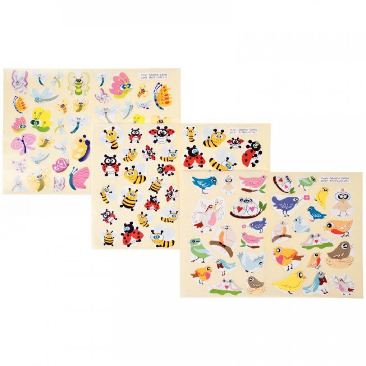 Pochette de 864 gommettes formes petites bêtes. 24 planches assorties avec différents motifs : abeilles et coccinelles, papillons, chenilles, libellules, petits oiseaux.