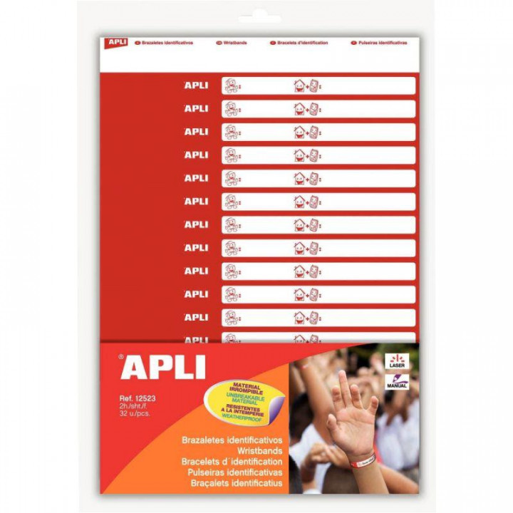 Etui de 32 bracelets d'identification 210x15 mm. Micro-perforés. Impression laser et écriture manuelle. Matière solide et résistante aux intempéries.