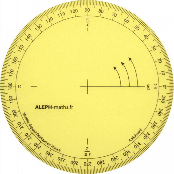 Rapporteur géométrique 360°. Graduation unique dans le sens trigonométrique. Il permet la mesure des angles obtus et rentrants, et il prépare aux cours de trigonométrie. Diamètre : 11cm.
