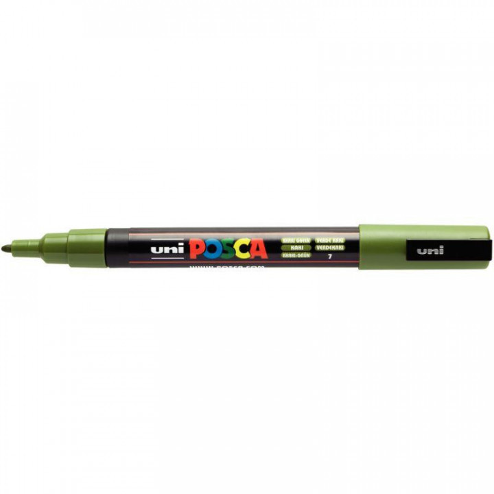 Marqueur Posca pointe fine ogive vert kaki. Les couleurs sont denses, opaques, couvrantes, superposables et ne pâlissent pas à la lumière. L'encre est inodore. S'applique sur tous supports : papier, bois, plastique, verre, métal… Peint, dessine, écrit et marque. Pour des applications illimitées !