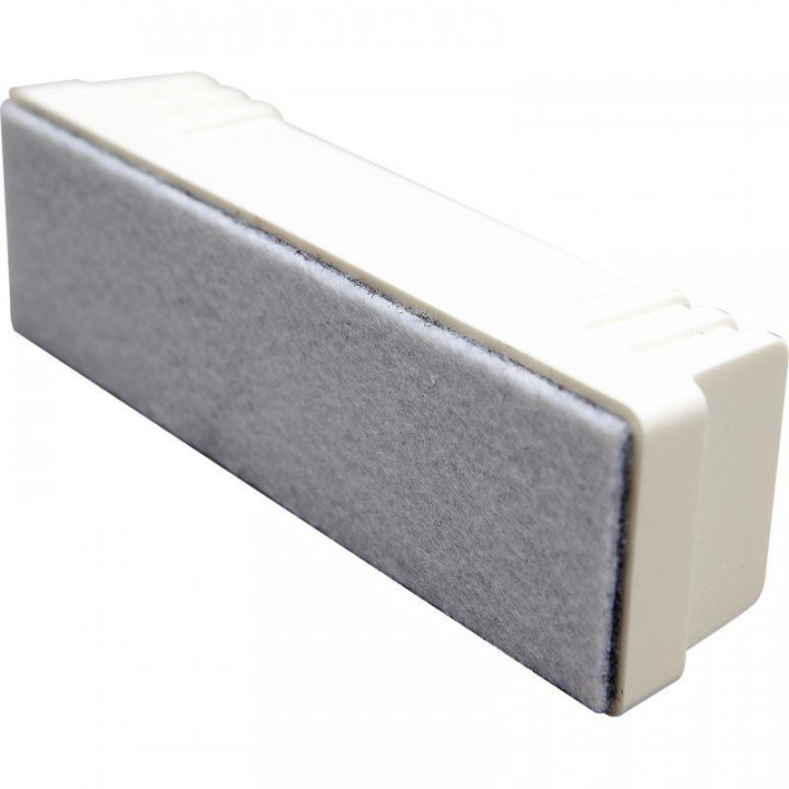 Effaceur magnétique Neodyme. Permet d'effacer l'encre des marqueurs effaçables à sec et s'utilise avec des recharges en feutre (réf. 6800000). Il est nécessaire de penser à changer la recharge en feutre régulièrement afin de pouvoir nettoyer facilement son tableau et conserver une surface impeccable. Très pratique, cet effaceur se fixe magnétiquement sur le tableau afin de toujours rester à portée de main. Recharge en feutre utilisable recto/verso maintenu par velcro. Dimensions : 145x45x40mm.