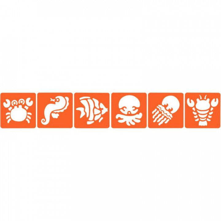 Paquet de 6 pochoirs en plastique, le monde aquatique. En plastique souple et lavable. 6 pochoirs différents par pochette. Dimensions : 14,5 x 14,5 cm. Utiliser une brosse à pocher d'un diamètre suffisant par rapport au motif à réaliser et une peinture suffisamment épaisse. Bien évacuer l'excédent de peinture de la brosse à pocher, puis effectuer des mouvements circulaires dans le pochoir. Ne pas tamponner, ce qui ferait baver la peinture sous les bords du pochoir. Les enfants peuvent utiliser un pinceau mousse.