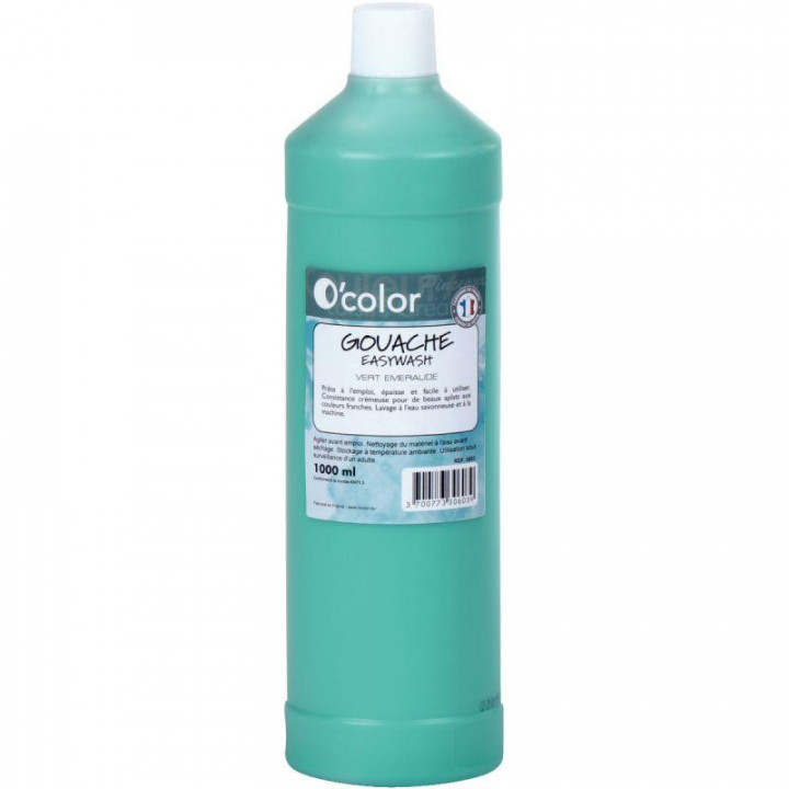 Flacon 1 L de gouache liquide économique O'COLOR coloris vert foncé. Gouache EASYWASH lavable à l'eau savonneuse et à la machine. Prête à l'emploi, épaisse et facile à utiliser. Consistance crémeuse pour de beaux aplats aux couleurs franches. Agiter avant emploi. Nettoyage du matériel à l'eau avant séchage. Stockage à température ambiante.