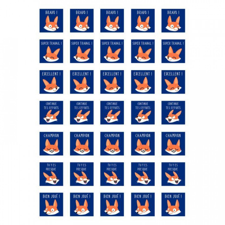 Pochette de 700 gommettes bon points appréciation. 20 planches. Dimensions planche : 14,8 x 21 cm. De jolies gommettes éducatives "bon point" qui aideront parents et enseignants à évaluer les cahiers des plus petits. Les messages associés à l'image du renard stimuleront les enfants.