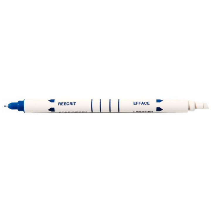 Effaceur réécriveur pointe biseautée. 1 corrige, pointe biseautée, l'autre écrit, pointe fine encre bleue.