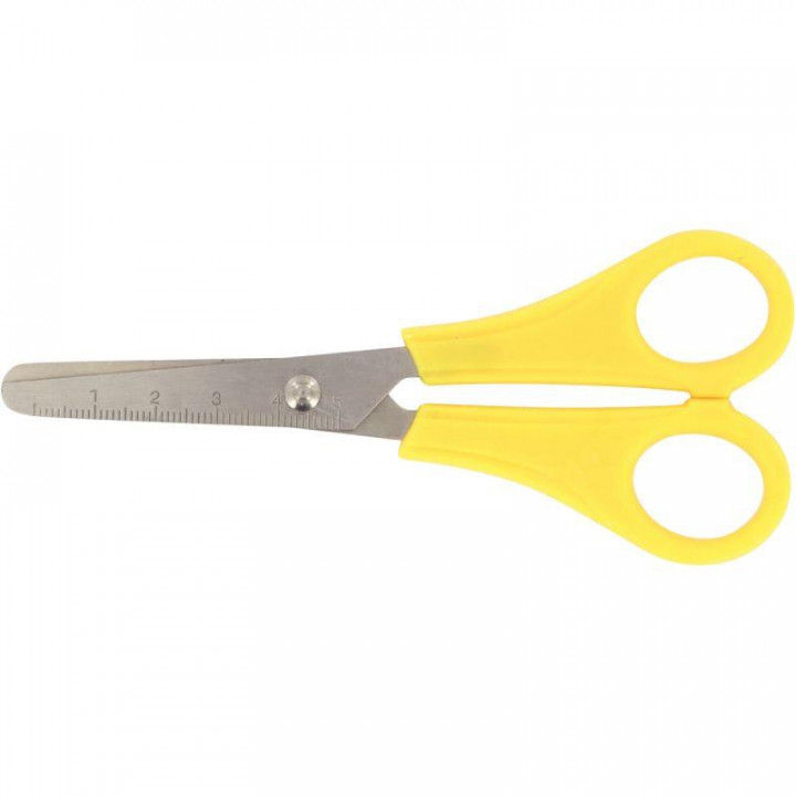 Ciseaux économiques pour droitier 13cm. Bouts ronds, anneaux en plastique ABS. Qualité acier inox trempé. Lames graduées. Coloris assortis : jaune, orange, vert