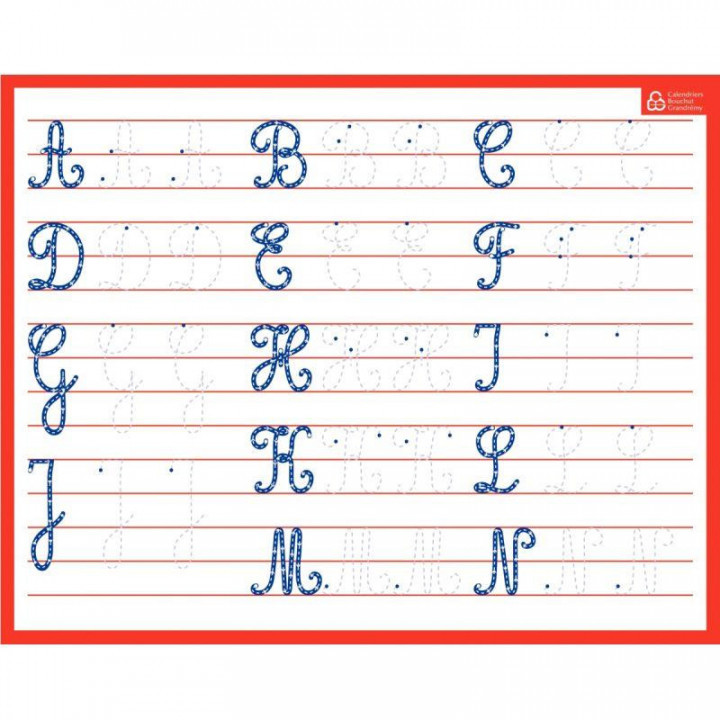 Ardoise effaçable à sec majuscules/cursives. Ardoise effaçable à sec, recto : majuscules cursives de A à N tracer en pointillés, verso : majuscules cursives de O à Z à tracer en pointillés. Format : 21x26.5cm