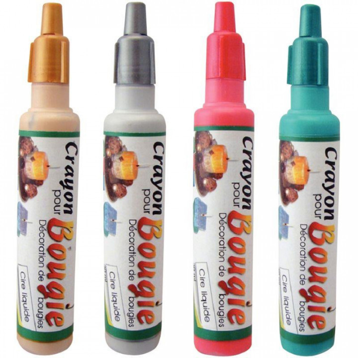 Lot de 4 crayons cire 30ml pour bougies. 4 coloris assortis : argent, or, rouge et vert. Cire liquide pour décorer et écrire directement sur les bougies avec la pointe ultra fine. Capuchons ventilés.